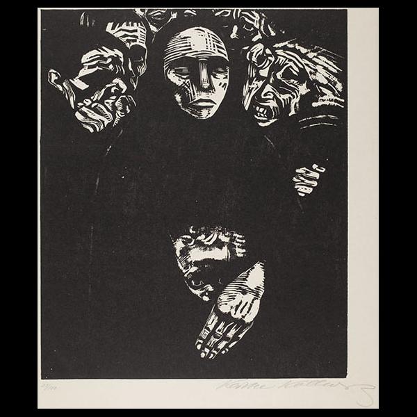 Kollwitz’s print cycle War (Krieg) comprises seven woodcuts created in 1922/23. Kollwitz began working on the series in 1918, drawing on motifs she started developing during World War I after the death of her youngest son, Peter, in October 1914. She sought to capture the wreckage wrought by war beyond the trenches. The seven prints depict its social toll, due in particular, to the decimation of the population of healthy young men in the era of mechanized war. The plates are as follows: The Victim, The Volunteers, The Parents, The Widow I, The Widow II, The Mothers, and The People.