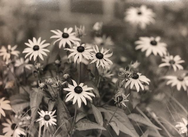 With this in mind, I want to share my own photography with you, and take you through the journey of a photograph’s development. Below, I’ve included a black-and-white photograph of daisies that I took on my middle school campus in the summer of 2006. I captured this photo primarily because I liked the subject matter. I find flowers beautiful to photograph because there are many different shapes and textures evoked, whether they be the crinkled petals, the wispy stalks of grass, or the leathery leaves. These textural components are pleasing to the eye and make for a versatile composition. I also feel that this photo comments on the cycle of life, a universal theme that audiences as a whole can relate to, as it displays a variety of flowers that are emerging, alive, or dying. Lastly, subjects such as these offer an opportunity to experiment with focus. As there are multiple flowers depicted, the photographer can choose which portions to focus on, and which to blur. These decisions make for a pleasing composition due to the variety of representations of the same subject.