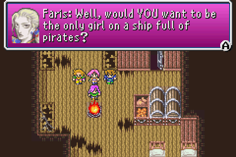 Lenna Charlotte Tycoon is the game’s princess character. She is the daughter of King Tycoon and heir to the throne of Tycoon. In the average Japanese Role Playing Game (JRPG), Lenna would be the main character’s love interest. However, the game does not explicitly have her falling in love with the game’s main hero, Bartz. Instead, Lenna thrives on her own and has compelling platonic relationships with the rest of the cast. If each character in Final Fantasy V represents an element, Lenna’s is water, which symbolizes devotion. She fights for her father, and is determined to rescue him when he goes missing. She accepts the duty the crystal gives her. When the Chancellor of Tycoon begs her to stay at the castle, she refuses his requests, feeling that her duty to save the world is more important than her life. Lenna is altruistic and kind, constantly risking her life for her loved ones. At one point in the game, Lenna willingly exposes herself to poison to save a wind drake from death. Her most compelling character relationship is with Faris.