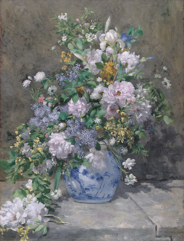 Spring Bouquet by Pierre-Auguste Renoir, 1866. This exquisite painting depicts a bountiful bouquet. It was one of Renoir’s earlier works in which he still drew heavy influence from realist painter Gustave Courbet, so the flowers are rendered extremely precisely rather than with the blurred borders that appear in his later paintings. The variety of flowers, detail, and array of colors make this work beautiful to behold. Pinks, greens, blues, yellows, and purples pour out of an exquisite blue and white vase, the various colors reminding us of warmer days to come.