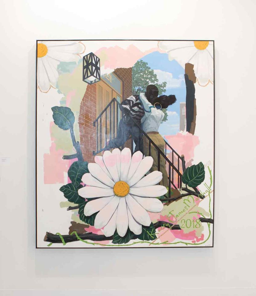 Vignette, The Kiss, by Kerry James Marshall, 2018. In this beautiful scene by Marshall, a young couple, perched on the stairs leading up to a house, shares an intimate moment. The scene feels very private and sweet, almost as if we are voyeurs looking in. I love how the right leg of the male figure is bent slightly, and how his right hand grips the railing – it makes the moment feel very sudden, as if he were taken by surprise by his lover’s embrace and kiss. Daisies, leaves, and ivy encircle and enliven the scene. Daisies, which represent new beginnings and love, are reminiscent of spring, and a perfect addition to this charming vignette, which creates excitement and anticipation for the days to come.