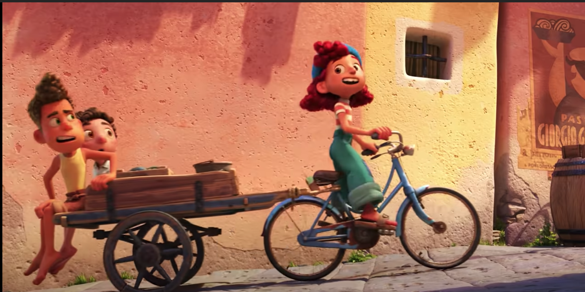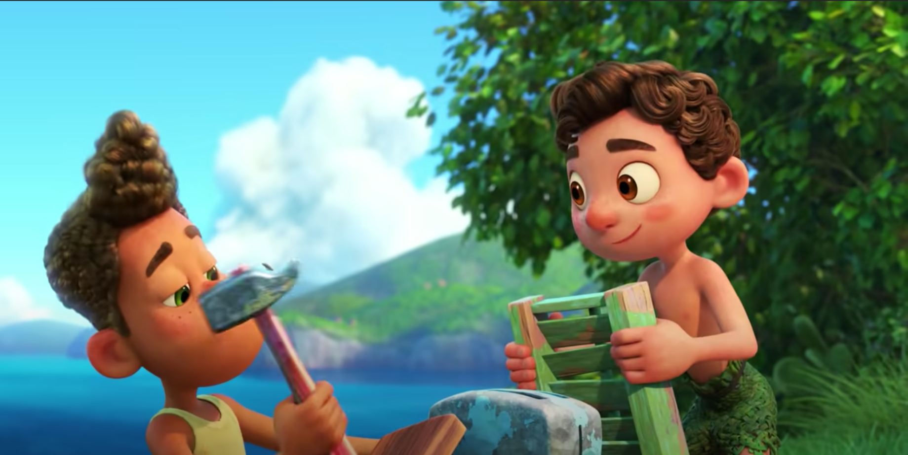 Luca is a deceptively simple movie. But that simplicity, coupled with a tight focus on character writing, make this movie such a triumph compared to Onward, which felt bloated and meandering. Luca’s worldbuilding does not ask you to think too hard, and everything is laid out in the first 20 minutes. The plot is straightforward, and the conflict is low key compared to Onward’s high stakes plot. In Luca, the boys need to win a race to buy their bike. It never gets deeper than that. These two factors allow the viewer to spend the rest of the movie laser focused on the character writing, and the simple approaches to the other areas of the movie allow characters like Luca and Alberto to have rich, moving arcs both together and individually. Luca’s arc as he comes out of his shell and develops friendships, passions, and interests feels genuine, and when he gets permission to go to school with Giulia, it is an emotional moment that feels so earned for him. Similarly, Alberto’s abandonment issues are deftly explored, and it is immensely rewarding to watch him quietly find a new family in Luca, and then in Massimo and the residents of Portorosso. Even Giulia has a little arc, where she learns that everything is easier (and better) with friends by her side. Luca feels like a slice of life movie, a genre that Pixar has never explored in their 25+ years of making films.